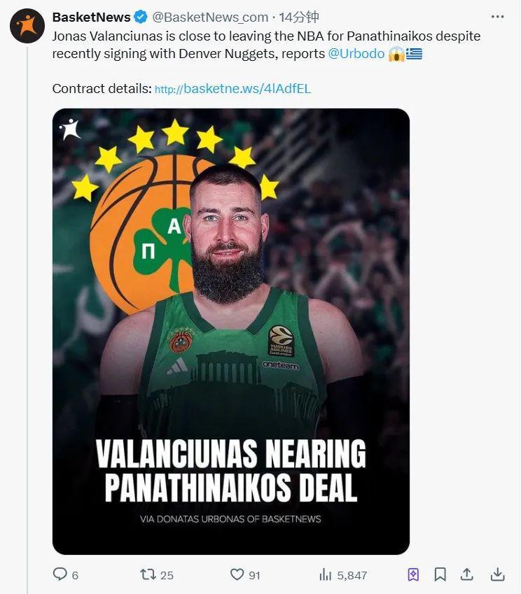欧媒BasketNews报道,消息源称,征战了13个赛季的瓦兰丘纳斯即将离开NBA,加盟希腊豪门帕纳辛纳科斯!帕纳辛纳科斯给瓦兰开出了3年1200万欧元的合同。而瓦兰现有的NBA合同仅有25-26赛季是保障合同,金额为1040万美元,26-27赛季是非保障合同。瓦兰可能会寻求买断自己的合同,从而加盟帕纳辛纳科斯。